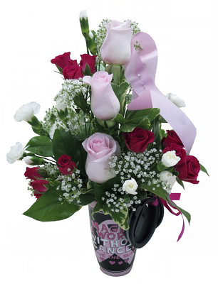 Save the Ta-Ta's mug is a special way to say I thinking of you. This cup is filled with pink and white roses and accented with a pink ribbon. This design is made one sided and approx." 19"h X 9"w.