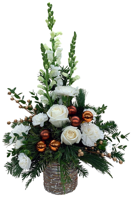 This copper color mosaic container is filled with white flowers and accented with copper balls and gold berries. This design is made one sided and approx: 23"h X 16"w.