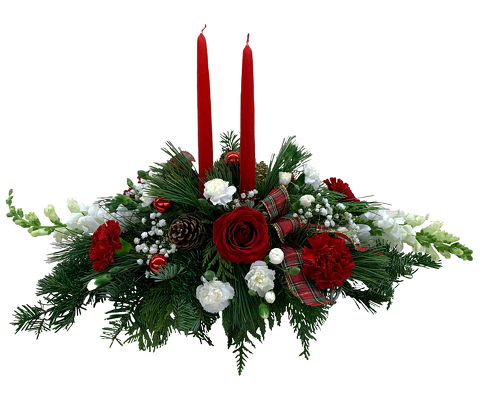 This arrangement is made with mixture of red and white flowers accented with balls and pine cones. This design oblong and approx.:15"w x 8"h.