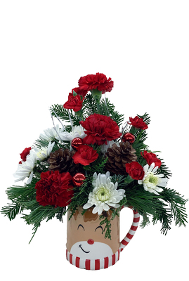 This reindeer mug in made one-sided with red and white flowers and approx.: 15"h x 12"w.
