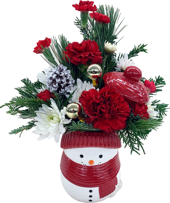 This snowman jar is good for after the holidays to store some candy for the winter season. This arrangement is made one-sided with red and white flowers, approx: 14"h X 8"w.