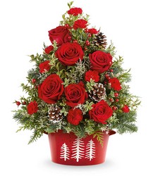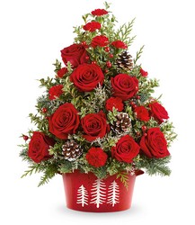 Bring holiday cheer home with the Holiday Traditions Tree. This festive floral tree of red roses, holiday greens, and pinecones is hand-arranged in our Snowy Pines Dish-perfect for tabletops or holiday gifting.