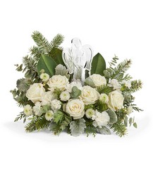 The Light of Love Bouquet offers a serene expression of the season. Elegant white roses and winter greens surround our keepsake Crystal Angel-perfect for Christmas, sympathy, or spiritual holiday decoration.