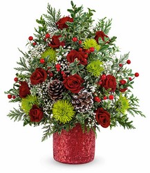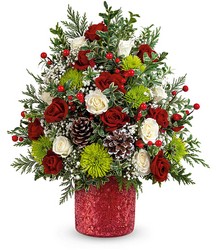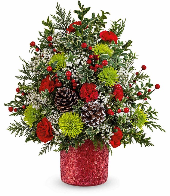The Holiday Cheer Tree is brimming with joy! Red carnations, green mums, and winter accents are hand-arranged in our sparkling Magical Wish Vase. This floral Christmas tree is a playful and festive gift for any holiday celebration.