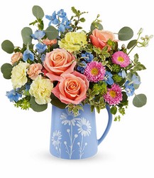 Brimming with fresh-picked charm, the Daisy Dreams Bouquet delights with peach roses, yellow carnations, and cheerful blooms arranged in a food-safe blue pitcher adorned with a sweet white daisy design.