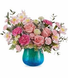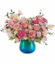 Soft and serene, the Blue Hues Bouquet delights with blush pink blooms and airy whites, artistically arranged in a translucent turquoise glass vase with a crackled finish and dreamy gradient. A beautiful way to share calm and joy.