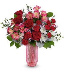 Celebrate love's radiant hues with this gorgeous bouquet! It features a stunning Valentine's Day mix of red and pink blooms in a shimmering faceted pink glass vase that sparkles with modern romance.