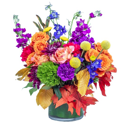 What is better than a down home greeting? Happier Fall Y'all with have them smiling from ear to ear. A clear cylinder vase is filled with fun roses, carnations, and mums to greet the recipient. Approximately 15"W X 16"H